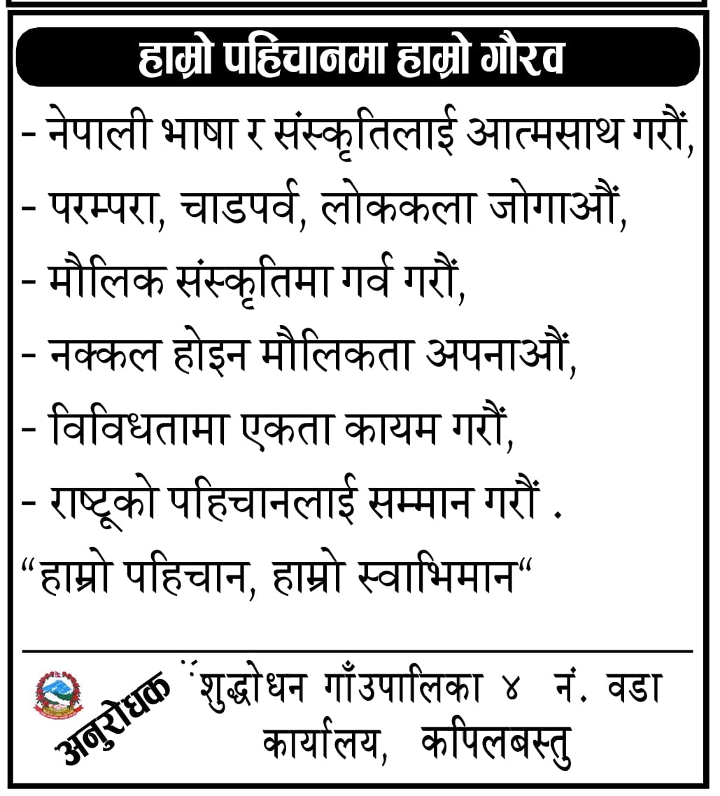 उक्त सामग्री दलित सामाजिक विकास केन्द्र र युनाइटेड मिसन टु नेपालको साझेदारीमा सञ्चालित जीवन सुधार परियोजनाबाट, यशोधरा गाउँपालिकाको समन्वयमा, सशस्त्र प्रहरी बललाई प्रदान गरिएको हो।